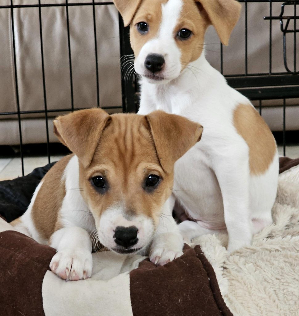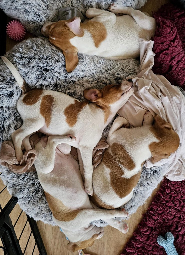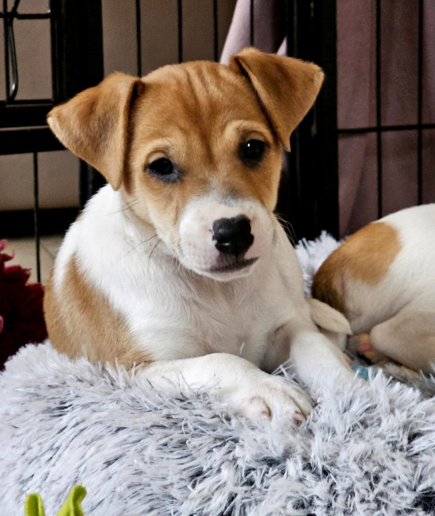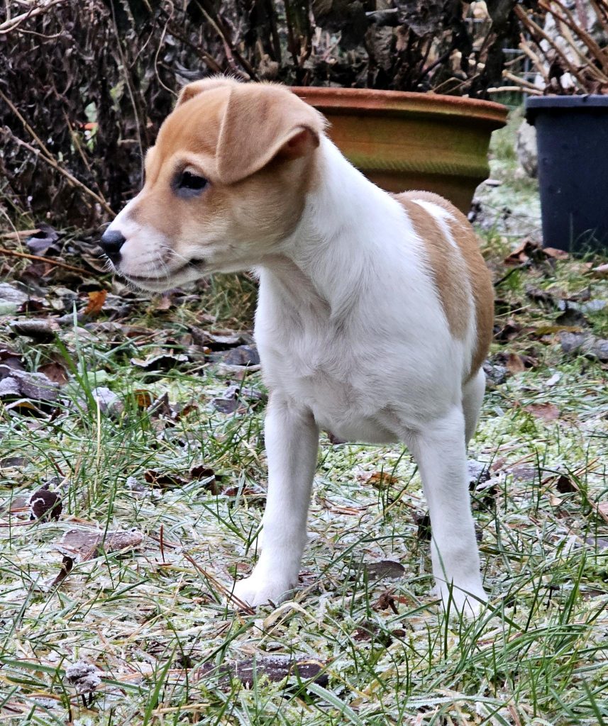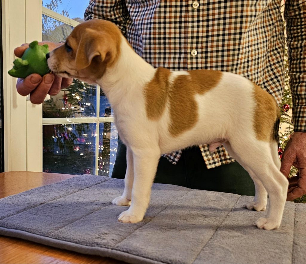 Bayou ist ein wunderschön gezeichneter, zehn Wochen alter, weiß-roter Rüde.