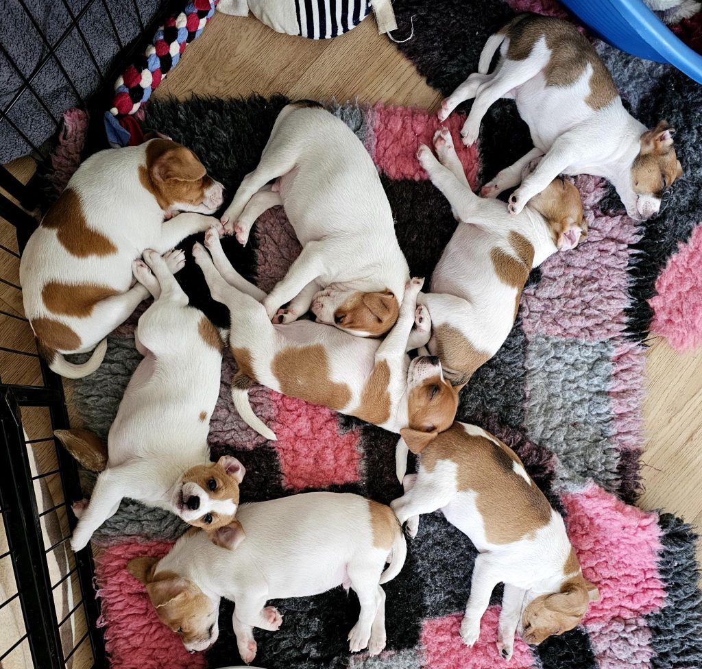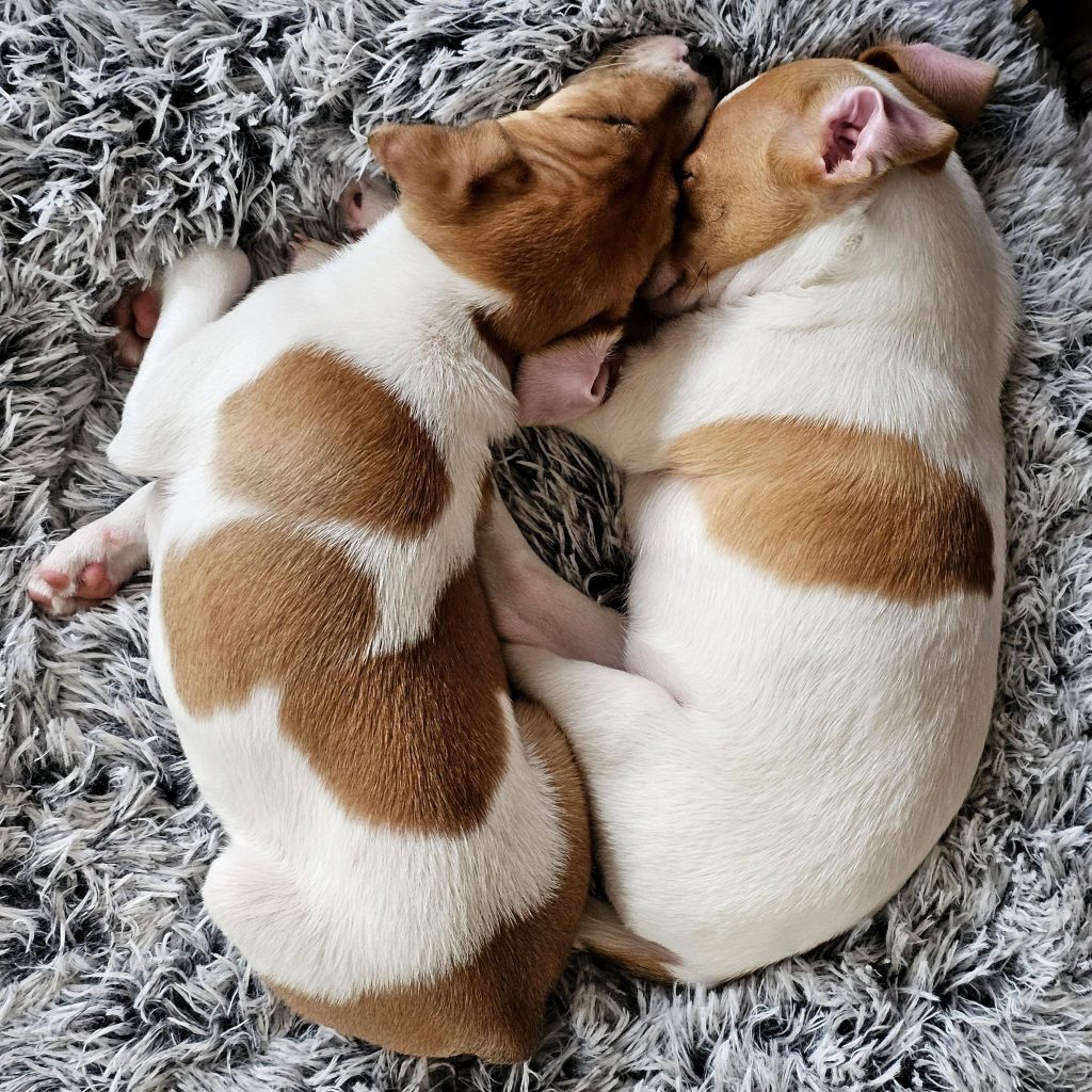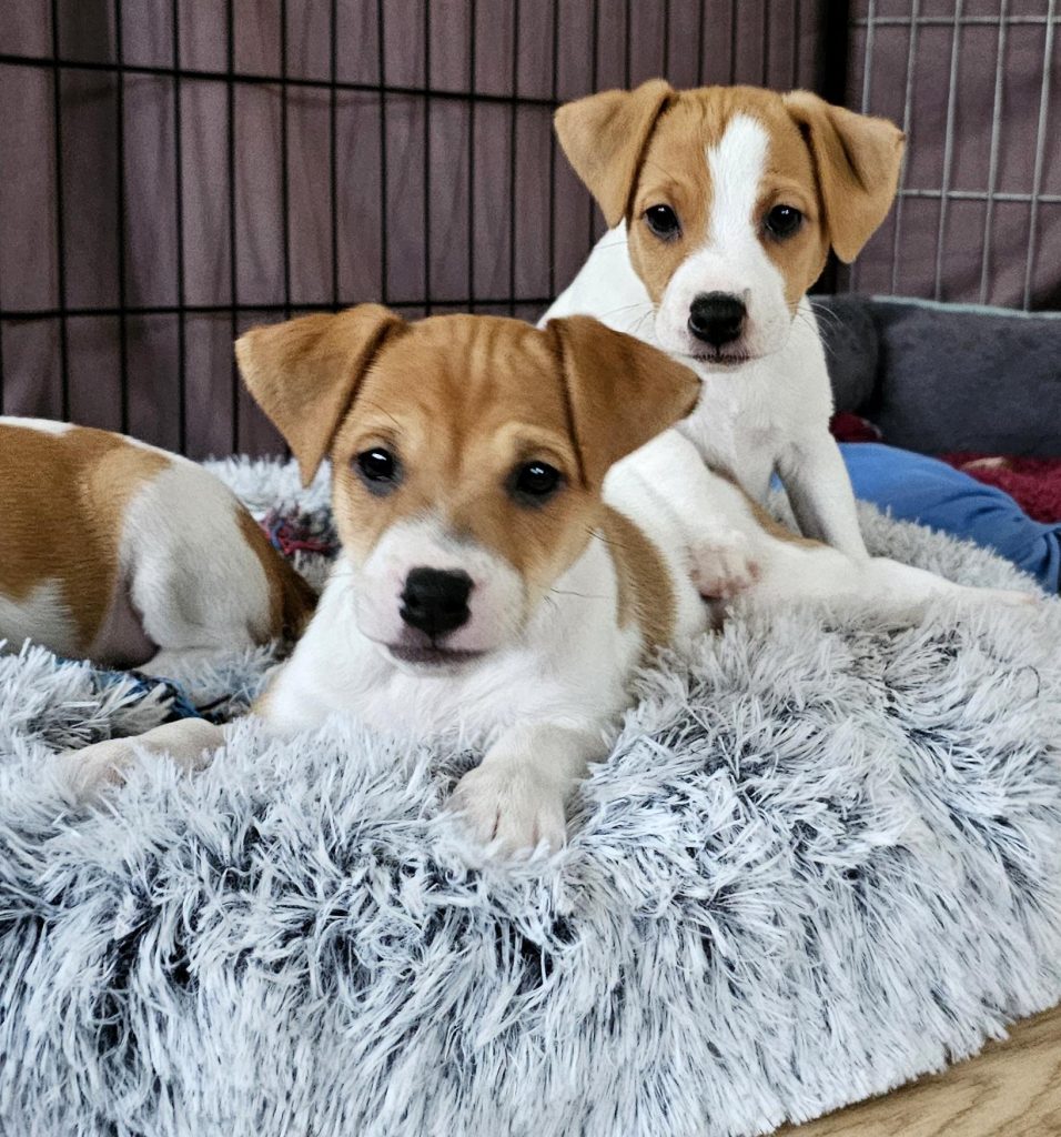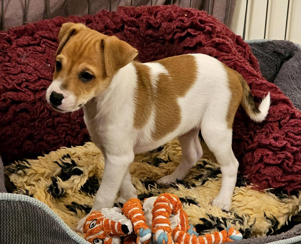 Bayou ist ein wunderschön gezeichneter, zehn Wochen alter, weiß-roter Rüde.